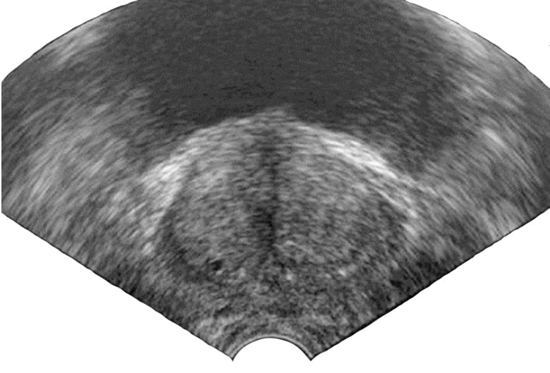 При ДГПЖ на ультразвуковых сканограммах определяется увеличение предстательной железы разной степени, которая в виде округлого образования с ровными контурами вдается в просвет мочевого пузыря (рис. 3). У некоторых больных предстательная железа приобретает грушевидную форму за счет изолированного увеличения средней доли. Более точно оценить состояние и направление роста предстательной железы при ее доброкачественной гиперплазии можно после трансректального УЗИ.